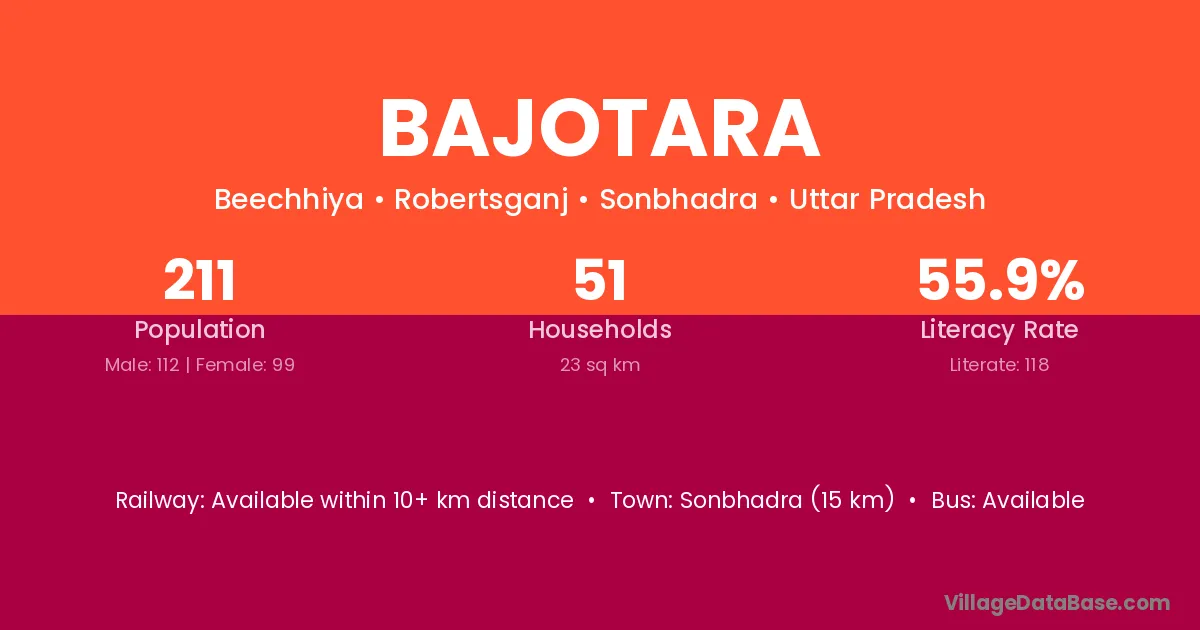 Sonbhadra (15 km) is the nearest town to Bajotara village for major economic activities and is located approximately 15 km away.