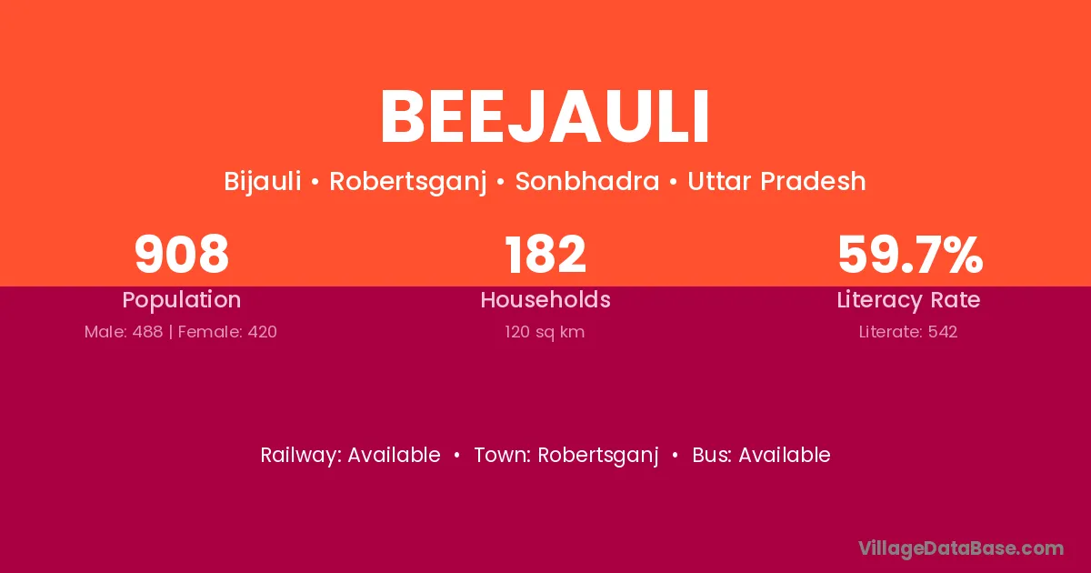 Beejauli village has a total population of 908 people, of which 488 are males and 420 are females.