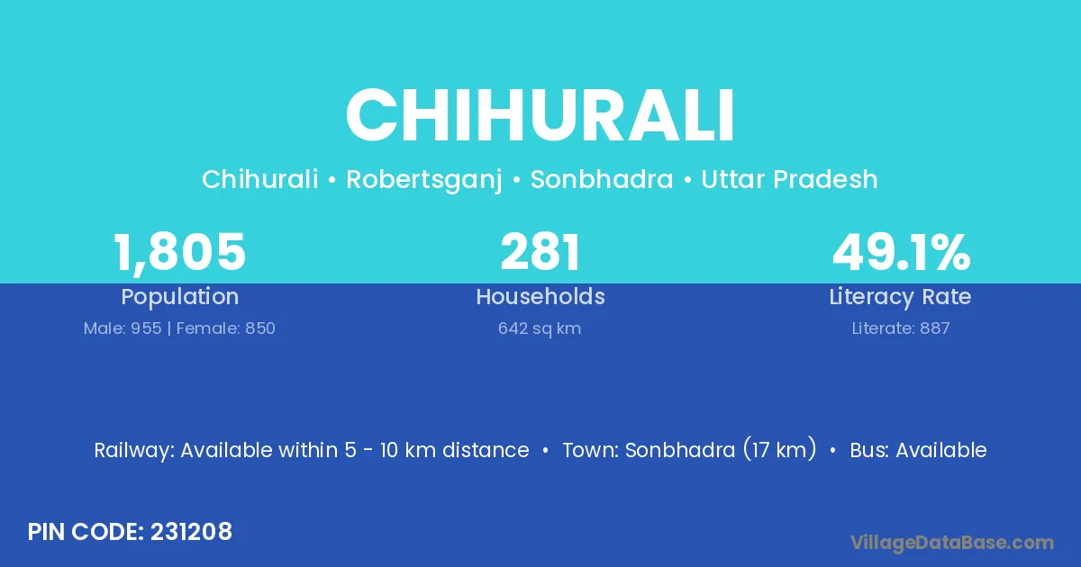 Sonbhadra (17 km) is the nearest town to Chihurali village for major economic activities and is located approximately 17 km away.