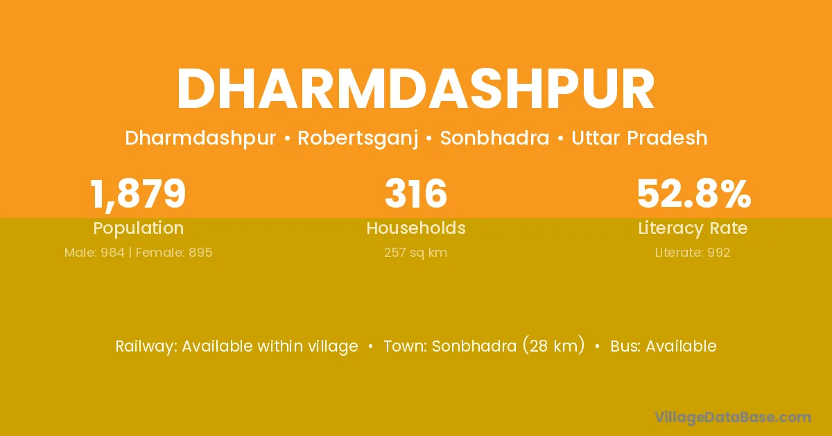 Sonbhadra (28 km) is the nearest town to Dharmdashpur village for major economic activities and is located approximately 28 km away.