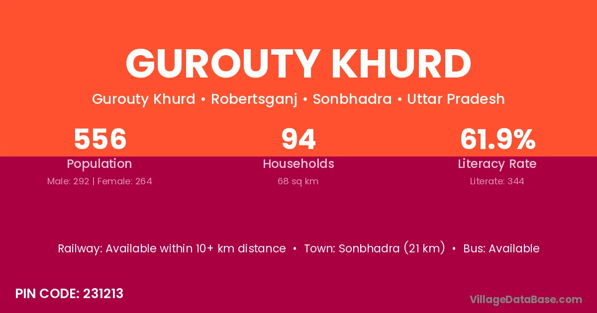 Sonbhadra (21 km) is the nearest town to Gurouty Khurd village for major economic activities and is located approximately 21 km away.