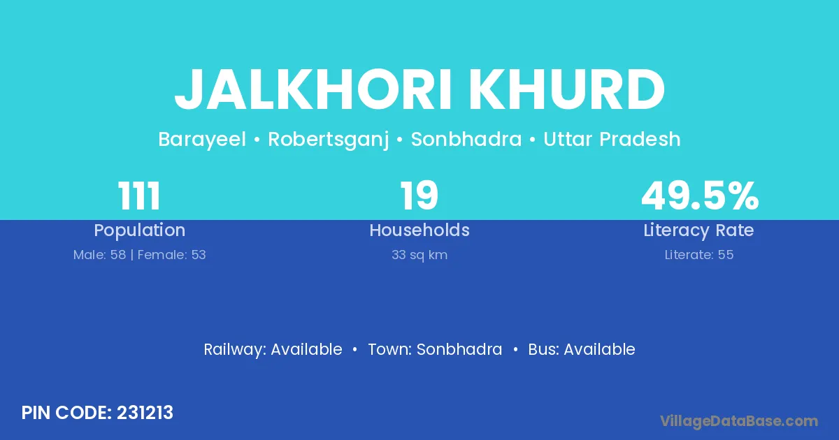 Sonbhadra is the nearest town to Jalkhori Khurd village for major economic activities