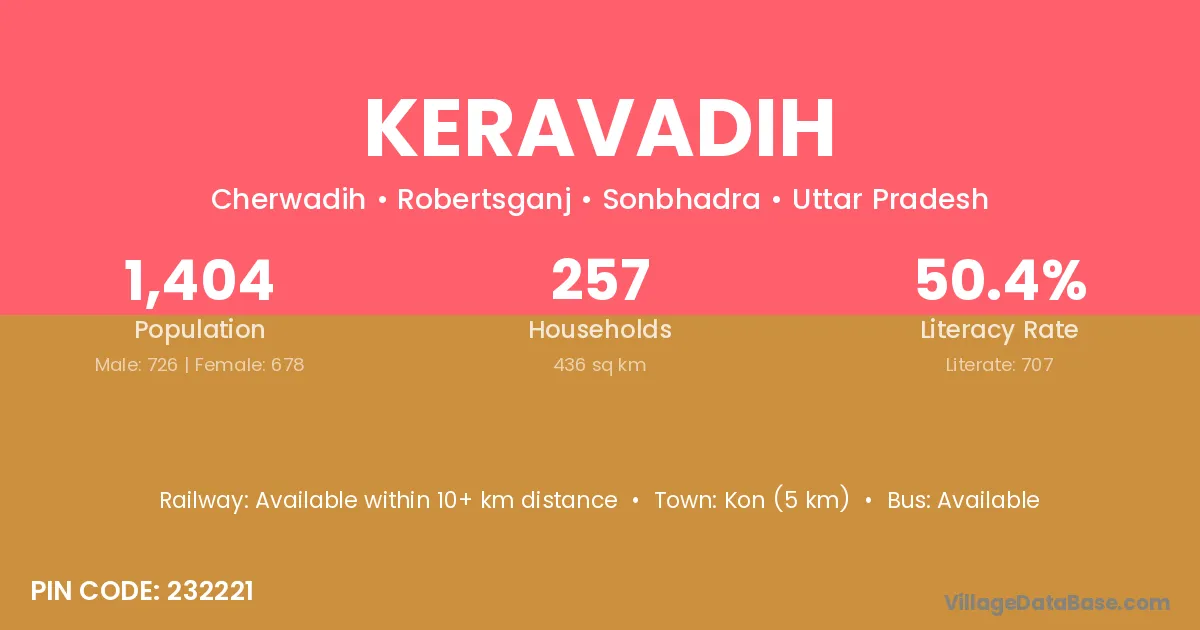 Keravadih village has a total population of 1,404 people, of which 726 are males and 678 are females.