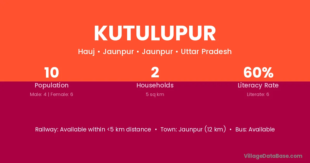 The literacy rate of Kutulupur village is 61.73%. Male literacy stands at 71.72% and female literacy at 50.78%.