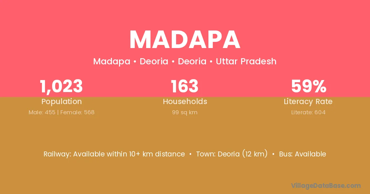 The literacy rate of Madapa village is 42.76%. Male literacy stands at 56.49% and female literacy at 27.54%.