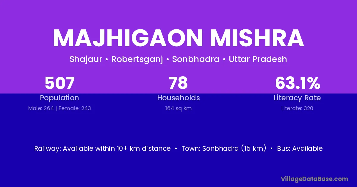 Sonbhadra (15 km) is the nearest town to Majhigaon Mishra village for major economic activities and is located approximately 15 km away.