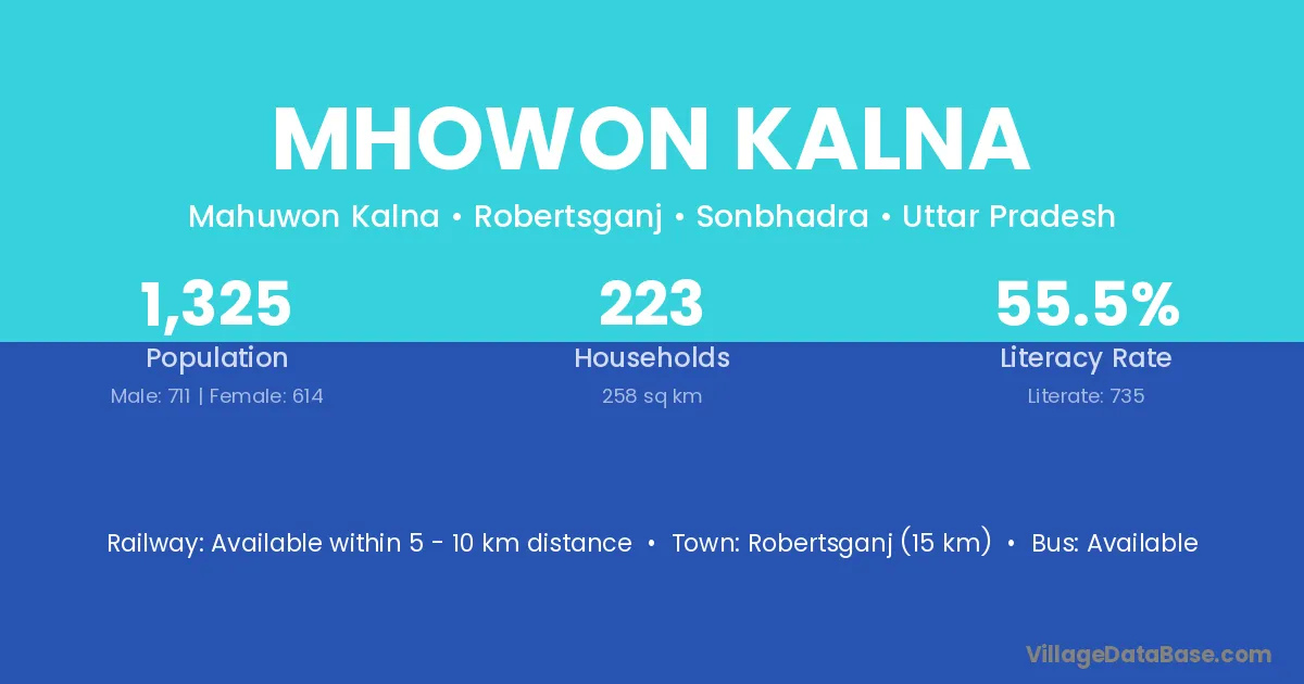Robertsganj (15 km) is the nearest town to Mhowon Kalna village for major economic activities and is located approximately 15 km away.