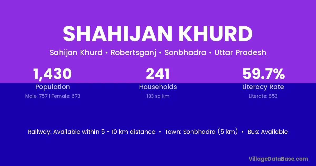 Sonbhadra (5 km) is the nearest town to Shahijan Khurd village for major economic activities and is located approximately 5 km away.