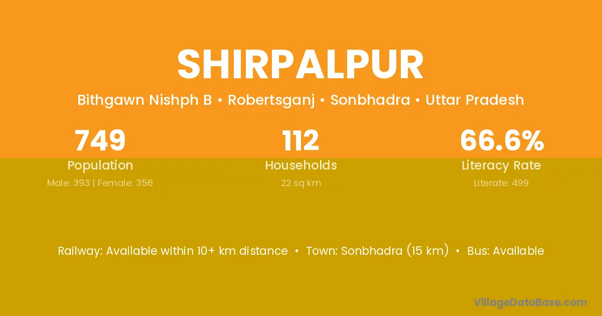 Sonbhadra (15 km) is the nearest town to Shirpalpur village for major economic activities and is located approximately 15 km away.