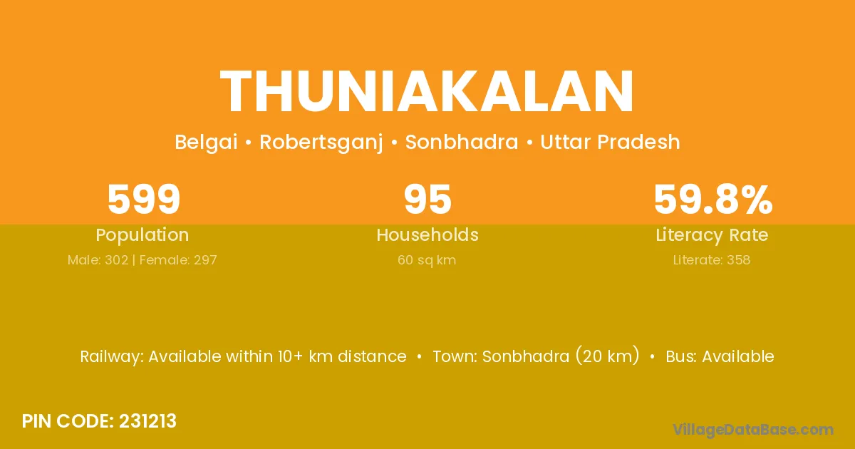 Sonbhadra (20 km) is the nearest town to Thuniakalan village for major economic activities and is located approximately 20 km away.