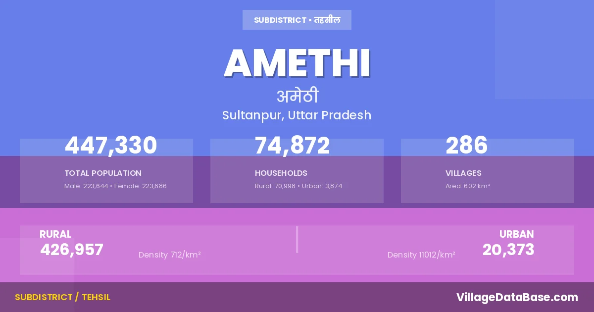 According to the 2011 census The total area of Amethi Tehsil is 602 km², with a population of 447330 people. The population density is 744 inhabitants per square kilometre, and there are approximately 74872 houses in the sub district.