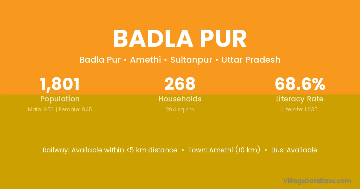 Amethi (10 km) is the nearest town to Badla Pur village for major economic activities and is located approximately 10 km away.