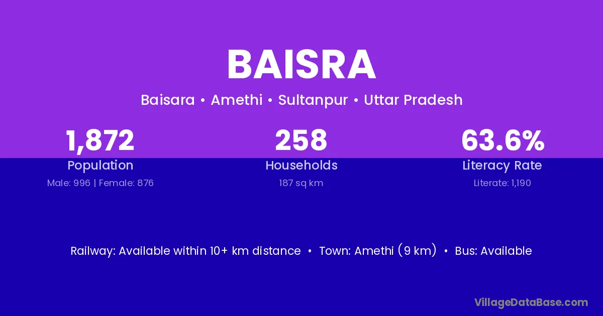 Amethi (9 km) is the nearest town to Baisra village for major economic activities and is located approximately 9 km away.