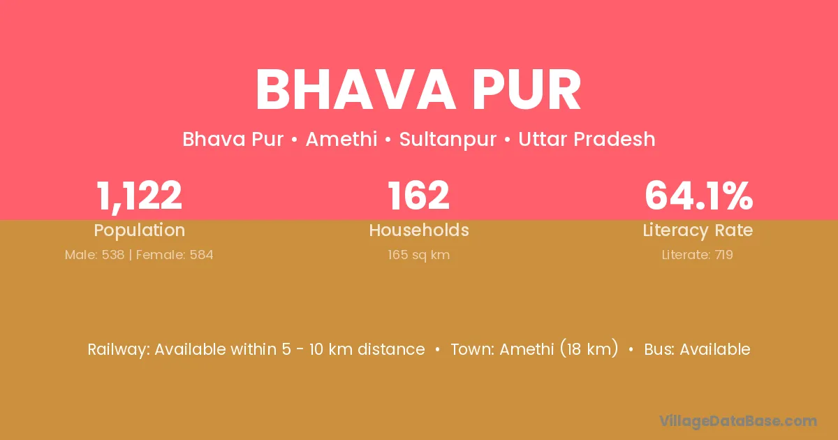 Amethi (18 km) is the nearest town to Bhava Pur village for major economic activities and is located approximately 18 km away.