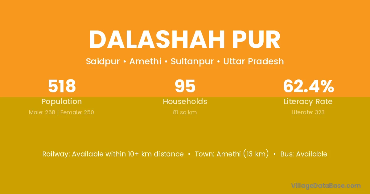 Amethi (13 km) is the nearest town to Dalashah Pur village for major economic activities and is located approximately 13 km away.