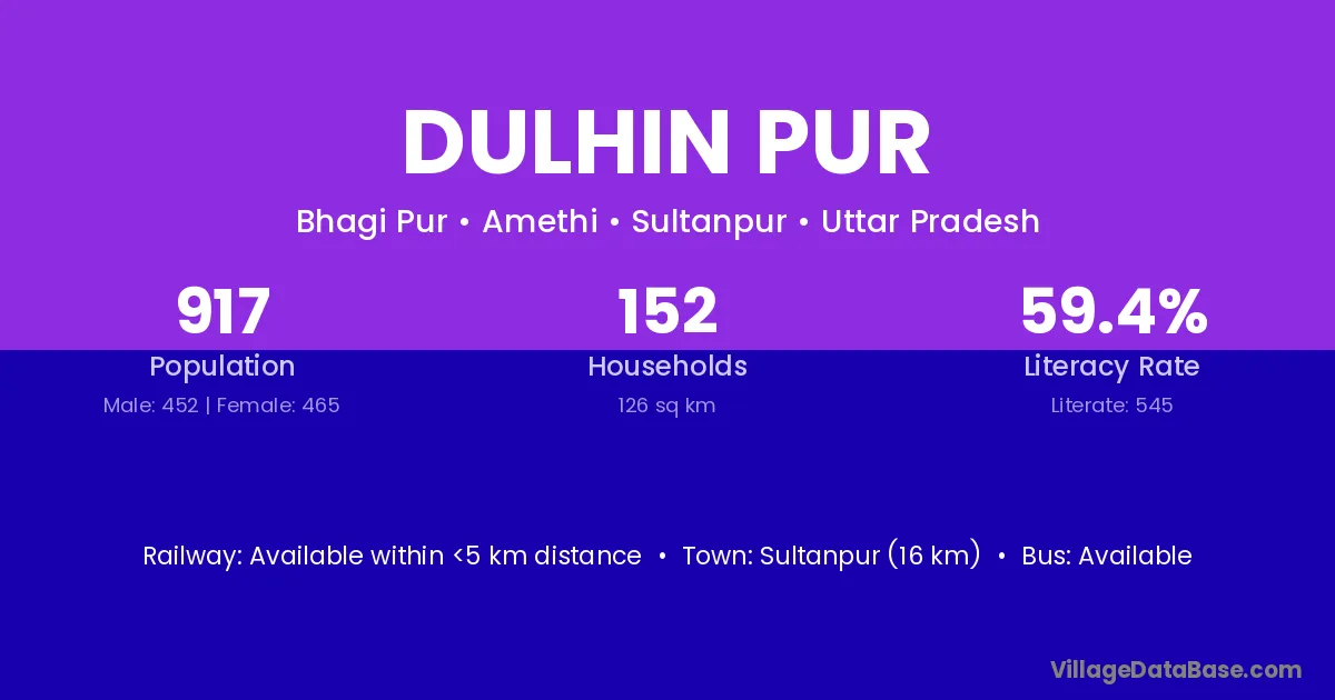 Sultanpur (16 km) is the nearest town to Dulhin Pur village for major economic activities and is located approximately 16 km away.