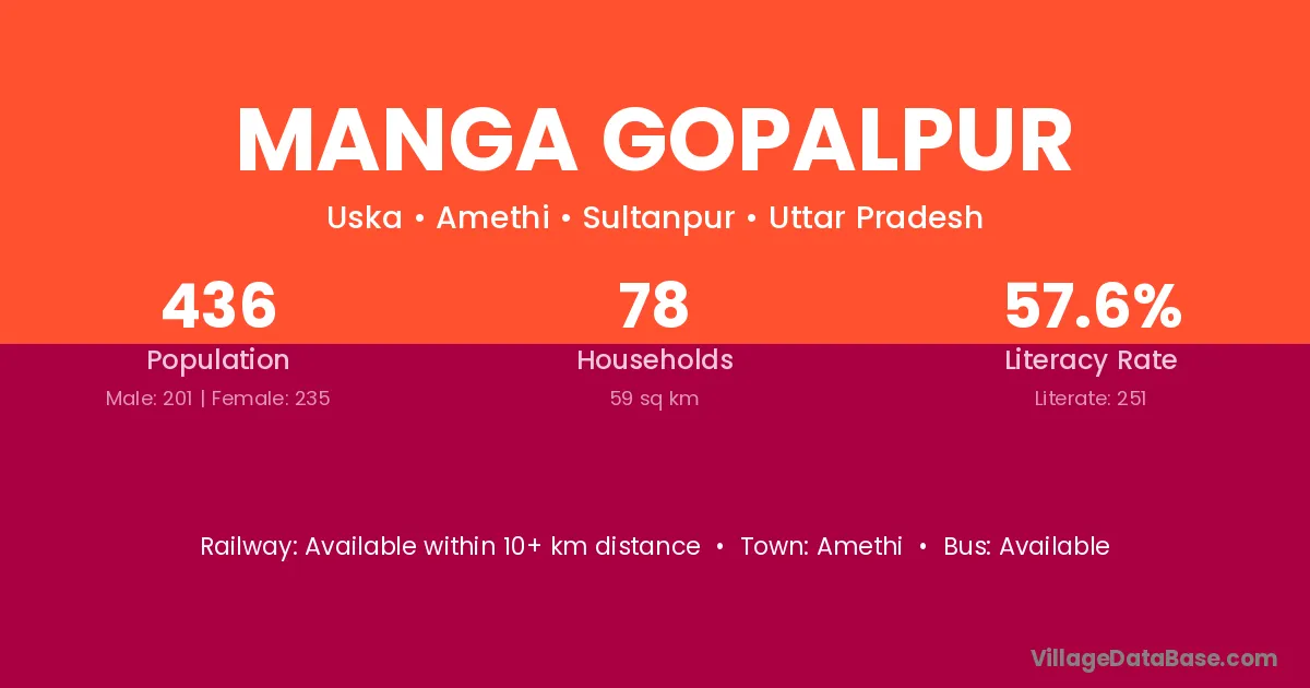 Manga Gopalpur village has a total population of 436 people, of which 201 are males and 235 are females.