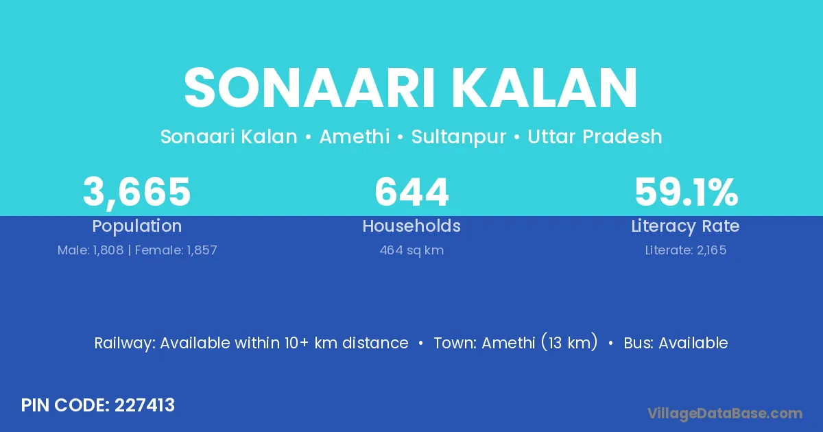 Amethi (13 km) is the nearest town to Sonaari Kalan village for major economic activities and is located approximately 13 km away.