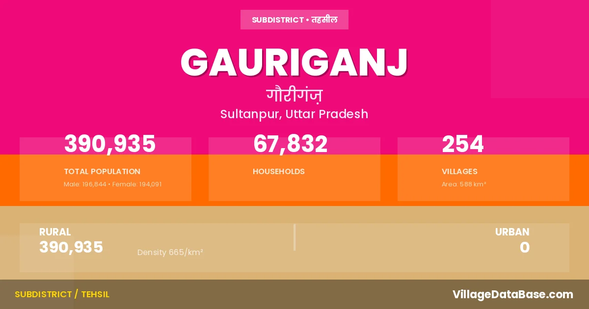 According to the 2011 census The total area of Gauriganj Tehsil is 588 km², with a population of 390935 people. The population density is 665 inhabitants per square kilometre, and there are approximately 67832 houses in the sub district.