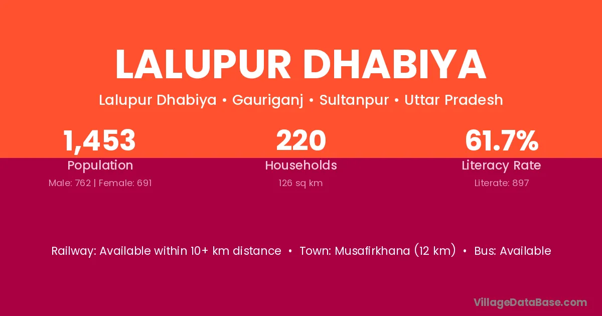 Musafirkhana (12 km) is the nearest town to Lalupur Dhabiya village for major economic activities and is located approximately 12 km away.