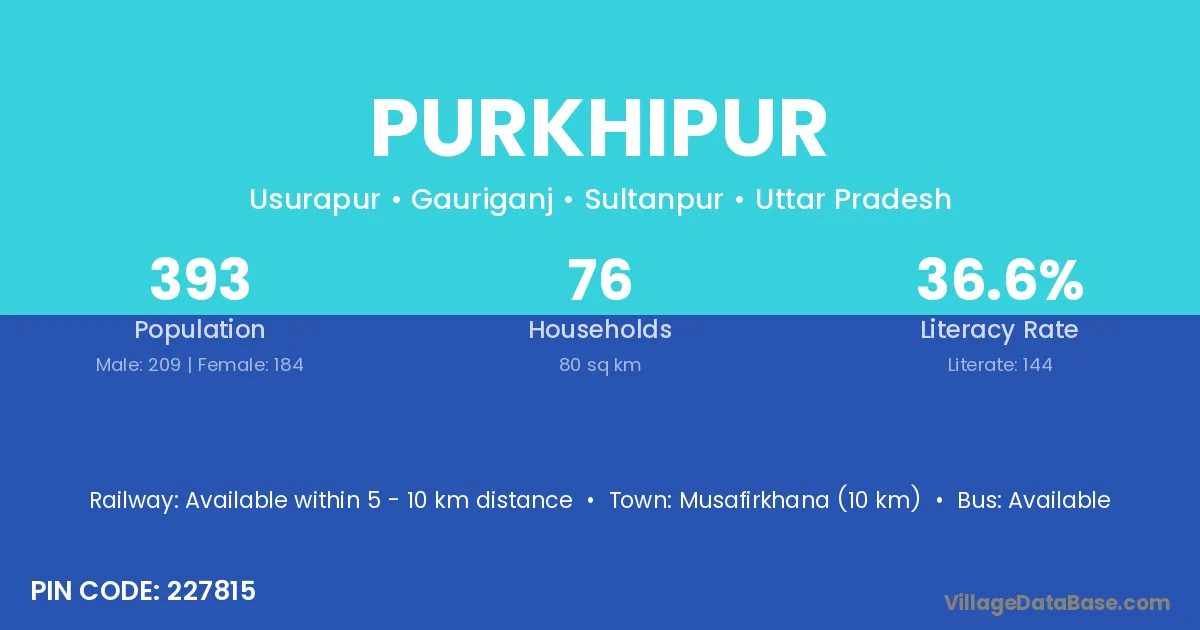 Musafirkhana (10 km) is the nearest town to Purkhipur village for major economic activities and is located approximately 10 km away.
