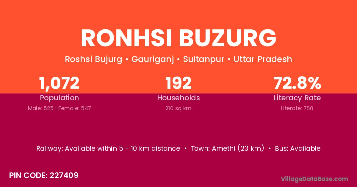 Amethi (23 km) is the nearest town to Ronhsi Buzurg village for major economic activities and is located approximately 23 km away.