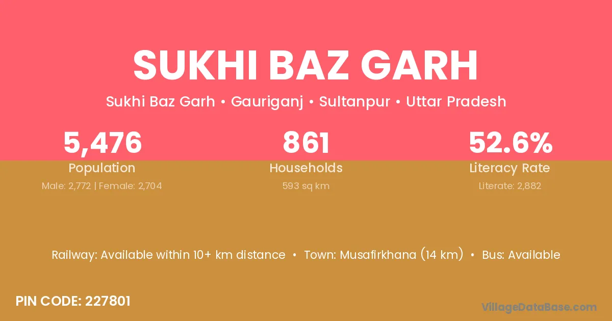 Musafirkhana (14 km) is the nearest town to Sukhi Baz Garh village for major economic activities and is located approximately 14 km away.