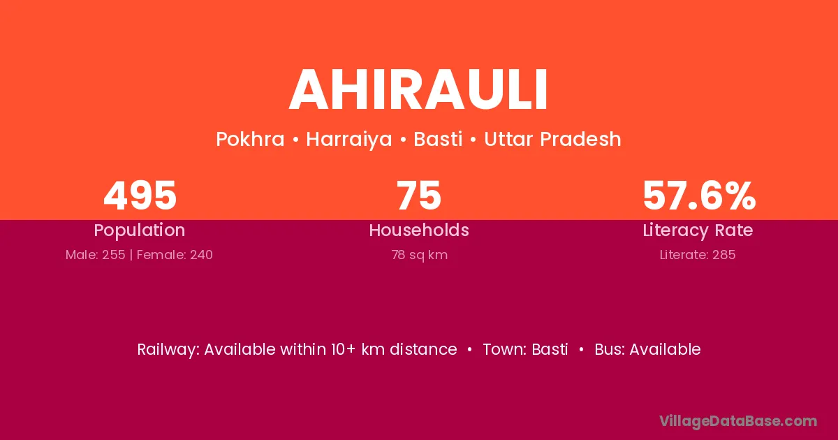 The literacy rate of Ahirauli village is 57.71%. Male literacy stands at 63.89% and female literacy at 51.11%.
