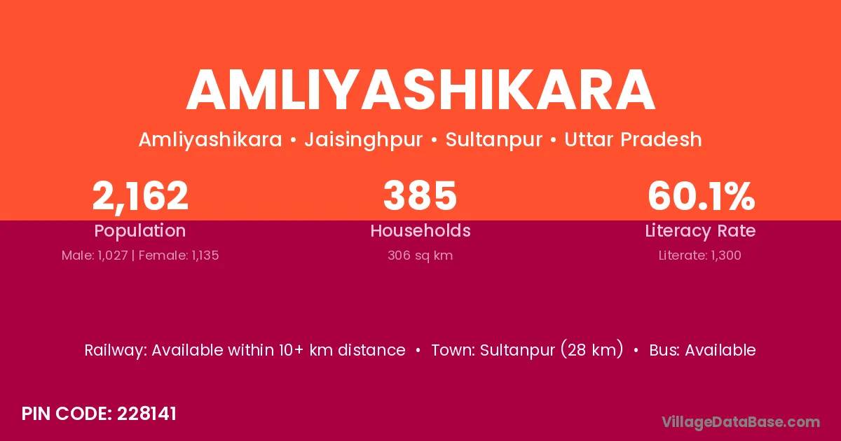 Sultanpur (28 km) is the nearest town to Amliyashikara village for major economic activities and is located approximately 28 km away.