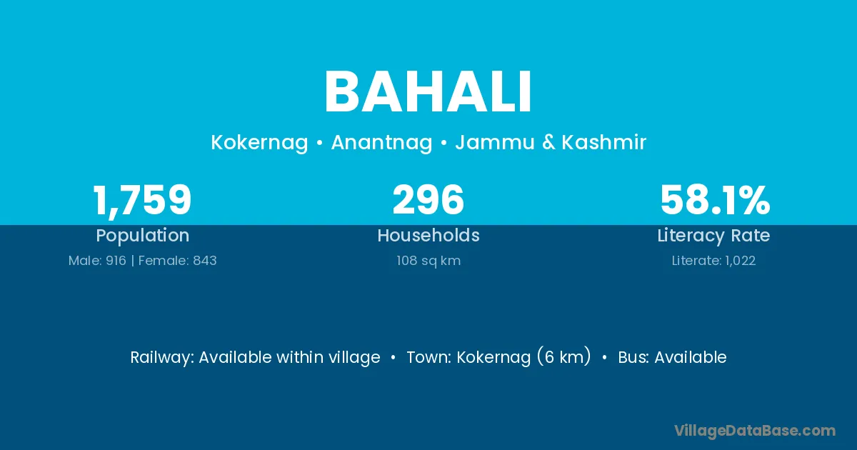 The literacy rate of Bahali village is 60.84%. Male literacy stands at 72.96% and female literacy at 47.92%.