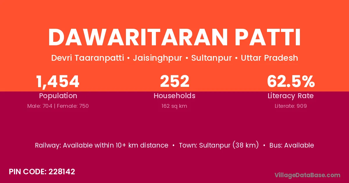 Sultanpur (38 km) is the nearest town to Dawaritaran Patti village for major economic activities and is located approximately 38 km away.