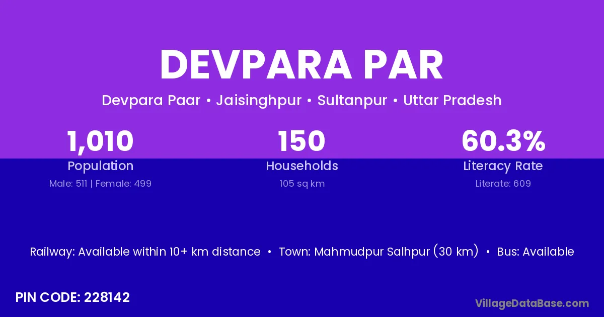 Devpara Par village has a total population of 1,010 people, of which 511 are males and 499 are females.