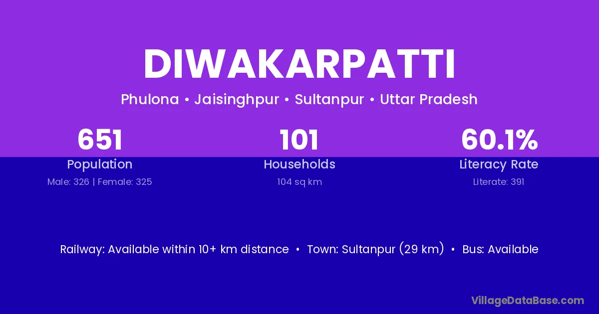 Sultanpur (29 km) is the nearest town to Diwakarpatti village for major economic activities and is located approximately 29 km away.