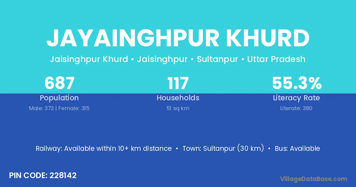 Sultanpur (30 km) is the nearest town to Jayainghpur Khurd village for major economic activities and is located approximately 30 km away.