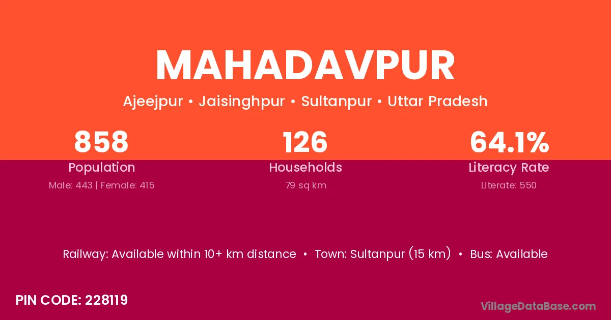 Sultanpur (15 km) is the nearest town to Mahadavpur village for major economic activities and is located approximately 15 km away.