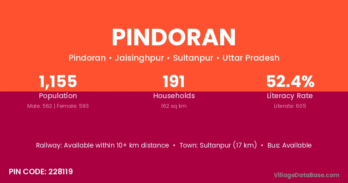 Sultanpur (17 km) is the nearest town to Pindoran village for major economic activities and is located approximately 17 km away.