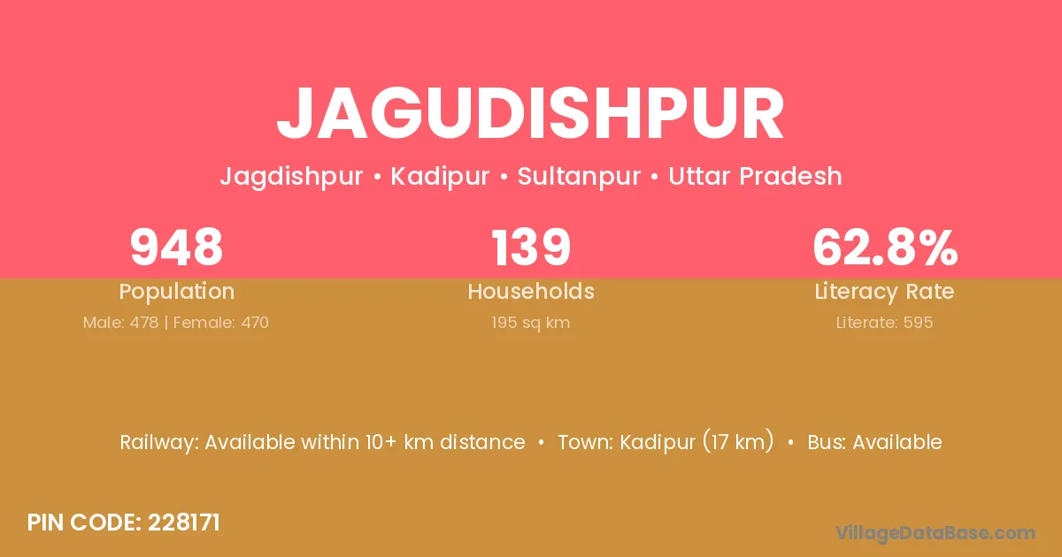Kadipur (17 km) is the nearest town to Jagudishpur village for major economic activities and is located approximately 17 km away.