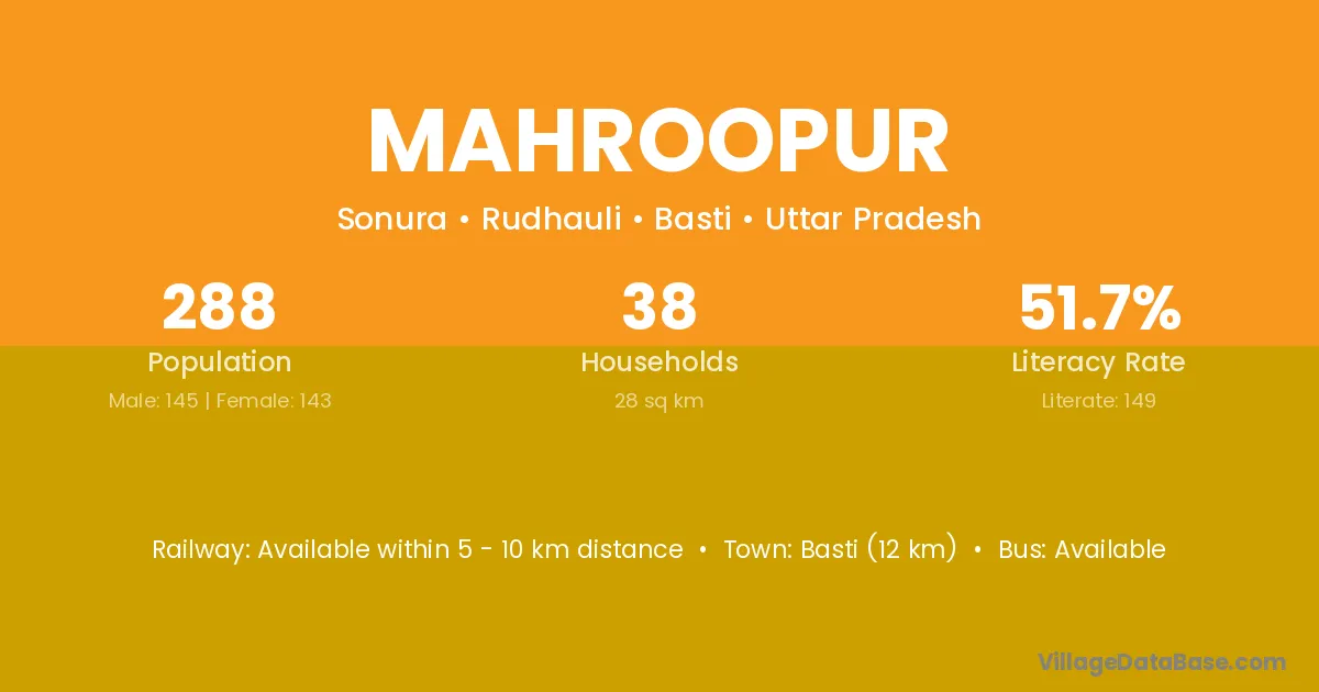 The literacy rate of Mahroopur village is 55.84%. Male literacy stands at 61.72% and female literacy at 50.00%.