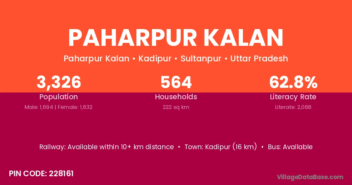 Kadipur (16 km) is the nearest town to Paharpur Kalan village for major economic activities and is located approximately 16 km away.
