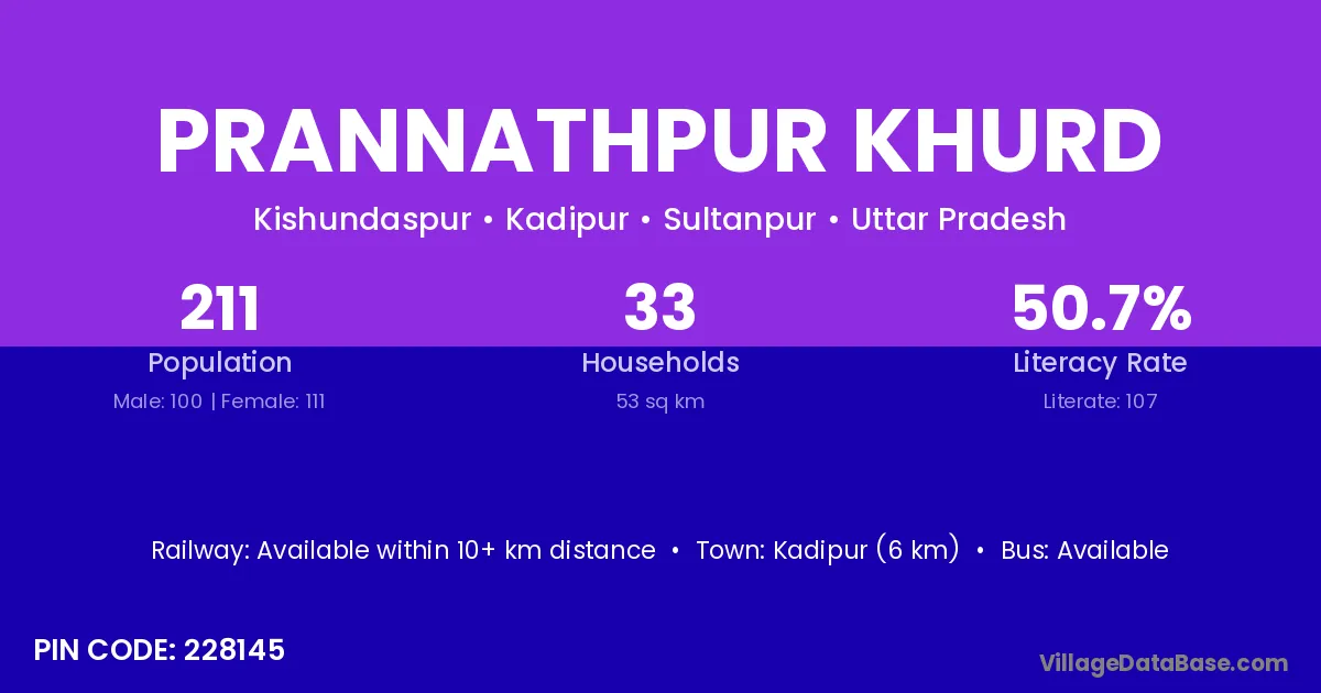 Prannathpur Khurd village has a total population of 211 people, of which 100 are males and 111 are females.