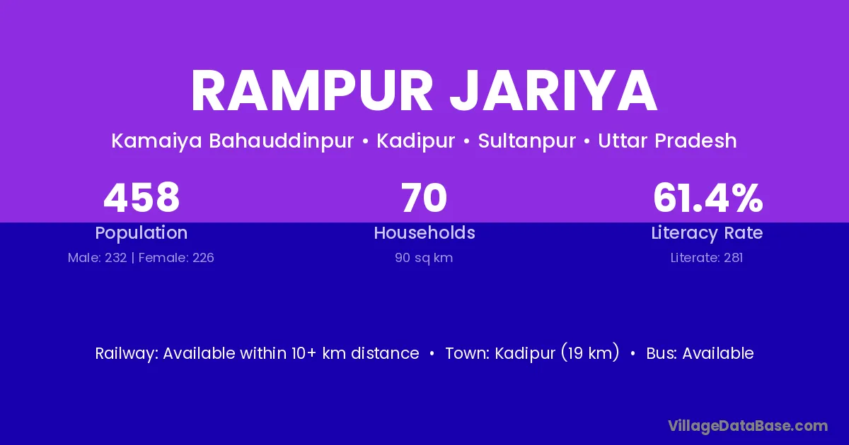 Kadipur (19 km) is the nearest town to Rampur Jariya village for major economic activities and is located approximately 19 km away.