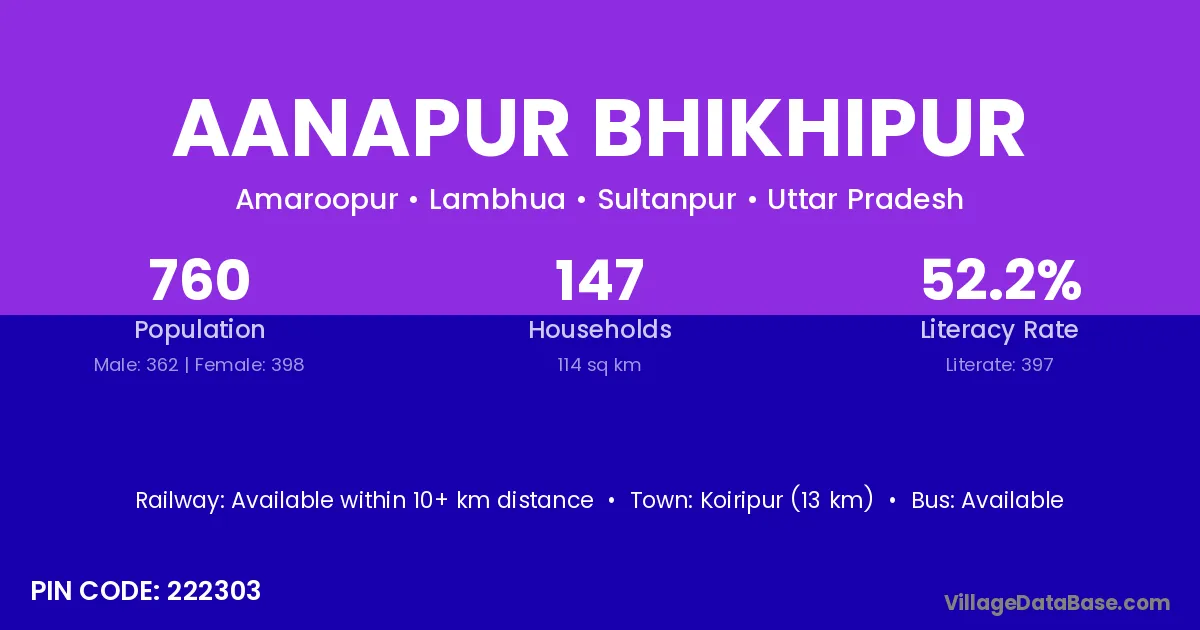 Aanapur Bhikhipur village has a total population of 760 people, of which 362 are males and 398 are females.