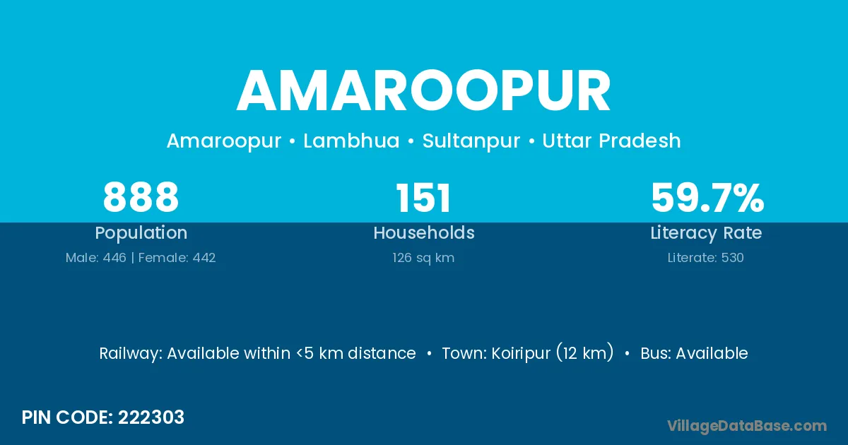 Amaroopur village has a total population of 888 people, of which 446 are males and 442 are females.