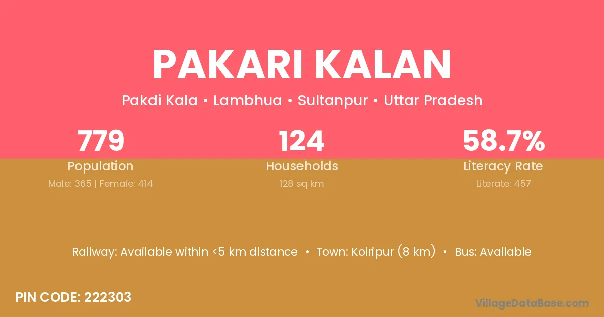 Pakari Kalan village has a total population of 779 people, of which 365 are males and 414 are females.