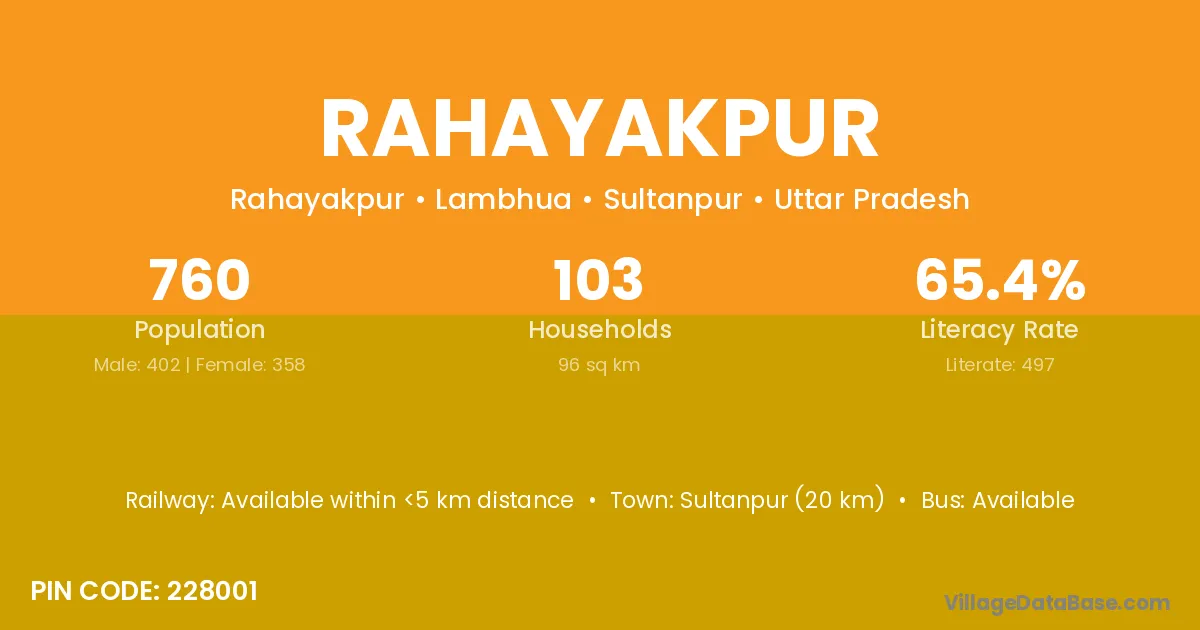 Sultanpur (20 km) is the nearest town to Rahayakpur village for major economic activities and is located approximately 20 km away.
