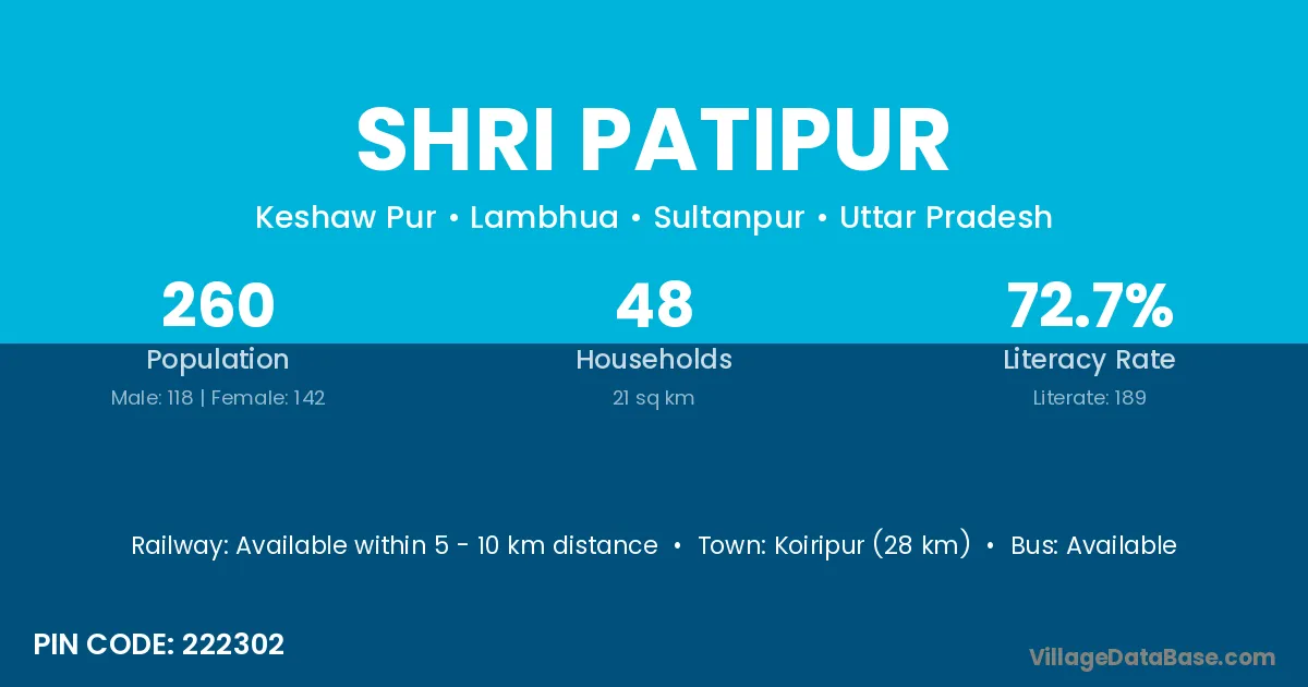 Shri Patipur village has a total population of 260 people, of which 118 are males and 142 are females.