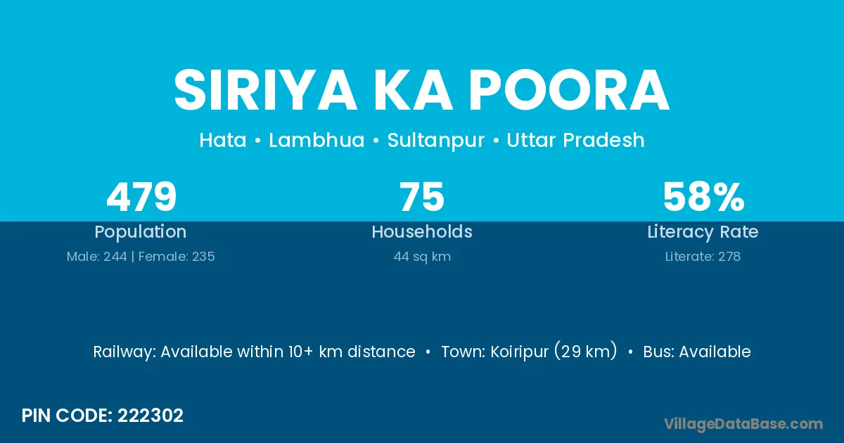 Siriya Ka Poora village has a total population of 479 people, of which 244 are males and 235 are females.