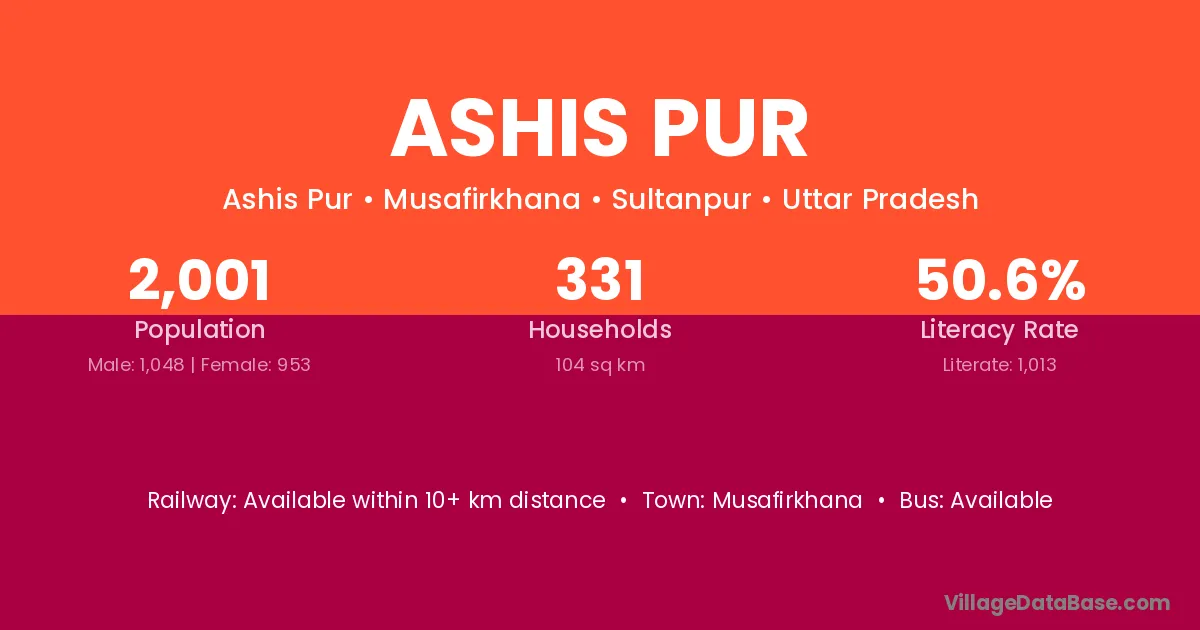 Ashis Pur village has a total population of 2,001 people, of which 1,048 are males and 953 are females.