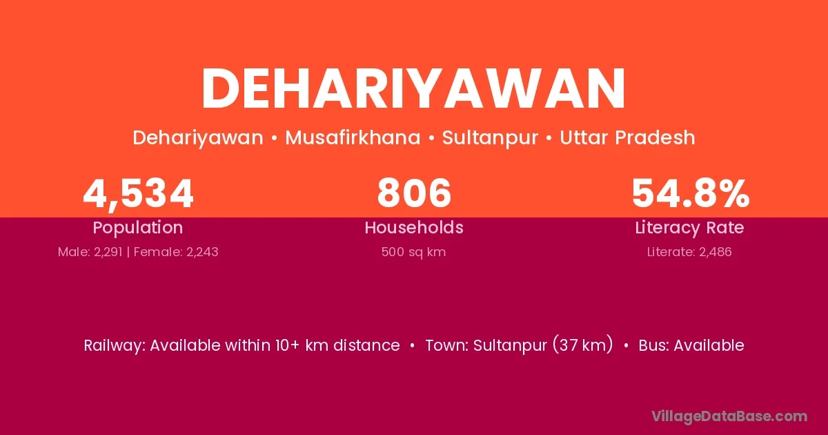 Sultanpur (37 km) is the nearest town to Dehariyawan village for major economic activities and is located approximately 37 km away.