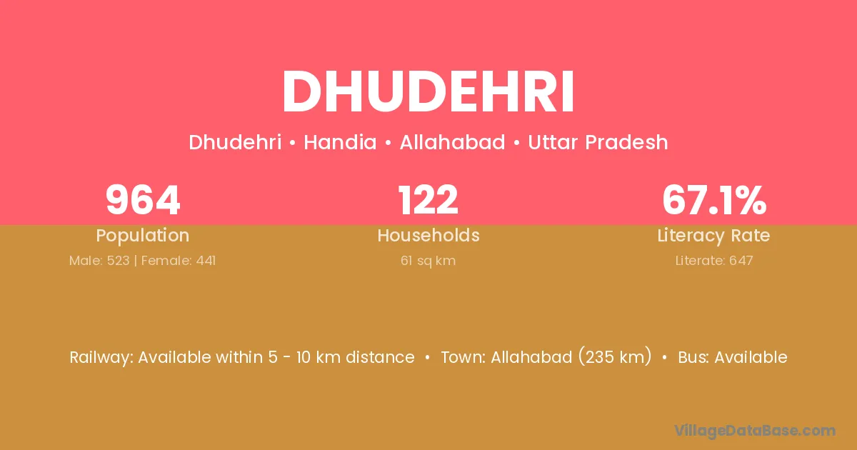 The literacy rate of Dhudehri village is 50.60%. Male literacy stands at 62.69% and female literacy at 37.99%.